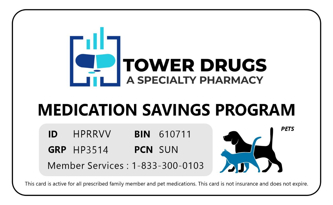 Unfortunately, pets have many of the same health issues as humans such as Diabetes, Arthritis, High Blood Pressure, to name a few. Because of this, the medications prescribed by veterinarians are often the same medications prescribed for people. Our pet program can provide discounts up to 80% off generic and up to 20% off brand pet drugs that have a human equivalent. Just make sure to ask your Vet for the prescription and you can have it filled at our pharmacy using the card below! This Medication Savings Program is a FREE card with no enrollment, activation, or expiration date.